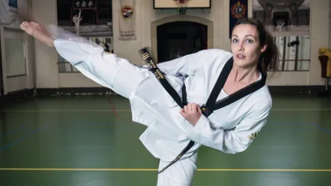 Het regent in Leiden als ik door de pittoreske historische straatjes van de binnenstad sjok. Mensen lopen, verscholen in hun dikke jassen, met norse gezichten over straat, balend van het feit dat ze vandaag alweer voor de vierde keer volledig natgeregend zijn. Ook ik schuif mijn sjaal nog maar eens recht, in een moedige poging om de regen buiten te houden. Ik ben op weg naar Monica Wink, de beste vrouwelijke taekwondoka van Nederland.