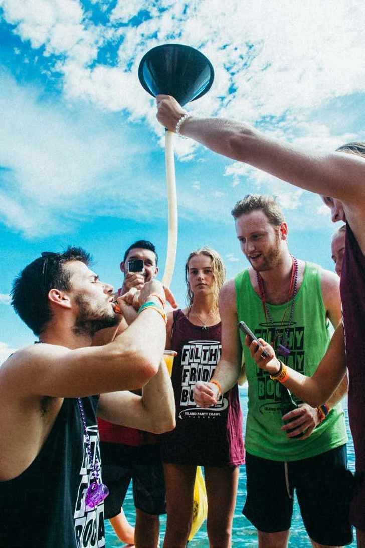 ‘Opstappen! We gaan naar de laatste bestemming,’ klinkt het. Bij Aqualounge wordt het langzaam schemerig. Naast een dansvloer en beer-pong-tafels is er ook een duikplank waar macho’s met salto’s indruk proberen te maken op de rest. Rond 22.00 uur wordt iedereen met watertaxi’s opgehaald en weer afgezet bij Colon, waar voor sommigen de softporno muziekvideo nog niet is afgelopen. De Nederlandse feestganger Sophie: