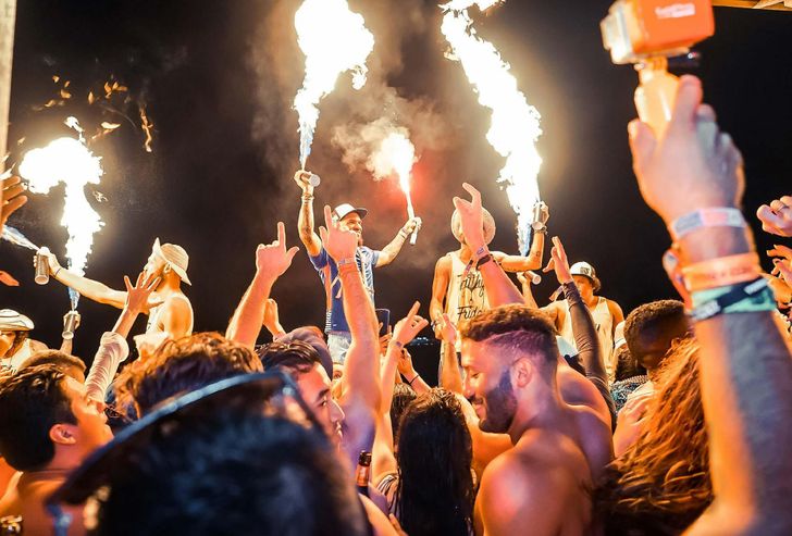 Na twee uurtjes inkomen, worden we in groepjes op boten naar de Blue Coconut gebracht, een bar op het water met blokken om op te dansen en een basketbalnet voor de sportievelingen. De instagrammers schieten hun foto’s en daarna begint de echte fuego; zowel op de houten vlonders als in het helderblauwe water wordt intiem met elkaar gedanst. ‘Dit heb ik nog nooit gezien,’ zegt Duitser Tobi (31). Het hele feest staat hij met een grote grijns om zich heen te kijken. Nijmeegse Sophie: ‘Het voelt als een party met locals en een paar toeristen.’