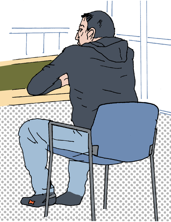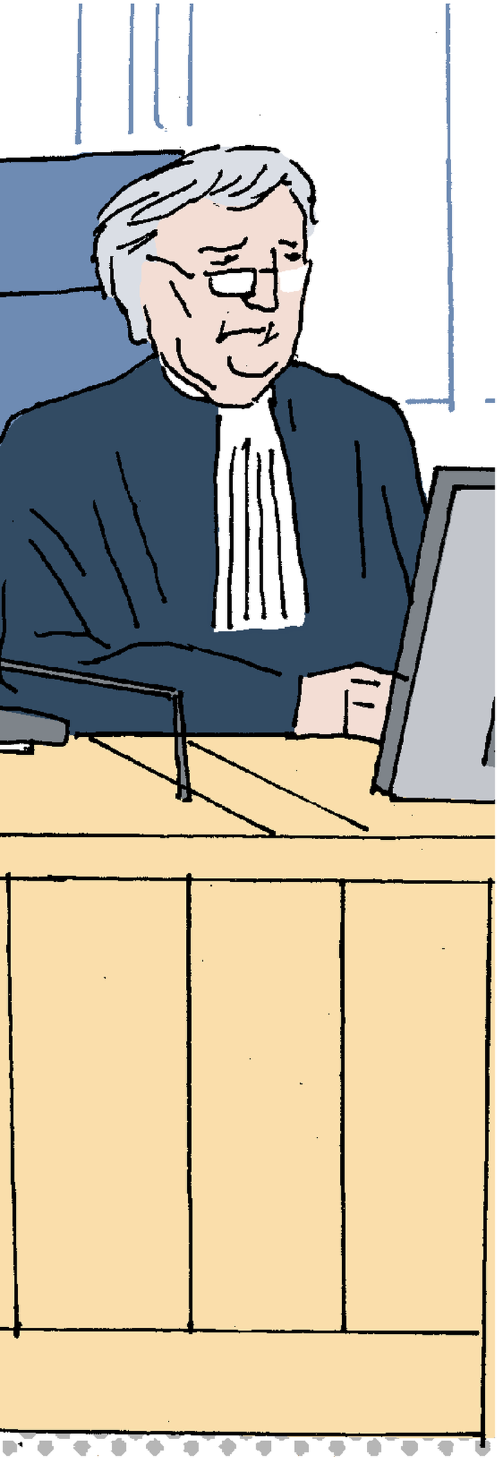 Het is rustig in de rechtszaal. De griffier kijkt glazig voor zich uit, terwijl de rechter wat met zijn handen over het bureau heen rommelt. De officier neemt een slokje water. Er zijn geen toeschouwers, dus los van het ritselen van papier is er niets aan de hand. De rechter kijkt een keer op de klok.