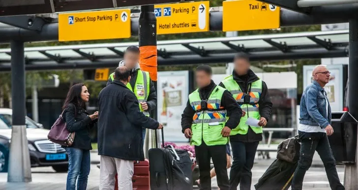 "Dat is geen Schiphol-gebied, maar openbaar terrein. Daar kunnen we alleen hinderlijk gedrag aanpakken." ,,We willen een structurele oplossing en daar gaat Schiphol niet over. Wat we in de tussentijd doen is omroepen: 'ga alleen met officiele chauffeurs mee'. En we hebben beveiligers en stickers op de grond met een looproute."
