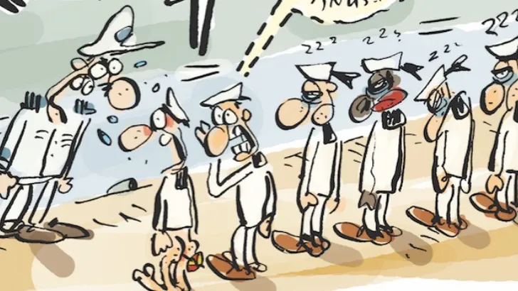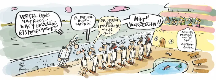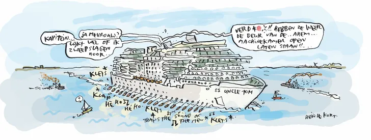 Het verhaal is geïllustreerd door Hein de Kort met deze heerlijke cartoons (klikken = vergroten). En mocht je na het lezen van de reportage nog twijfelen om te gaan solliciteren als scheepsslaaf, scroll dan naar beneden voor de voors en tegens van werken op een cruiseschip.