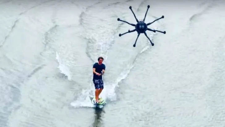 Drone-surfen is een combinatie van wakeboarden en kitesurfen en je hebt er dus geen boot of wind voor nodig. Wel een Freefly ALTA 8, een ijzersterke drone. Deze octocopter wordt onder meer gebruikt door professionele filmmakers en is in staat om de zwaarste camera's te dragen.