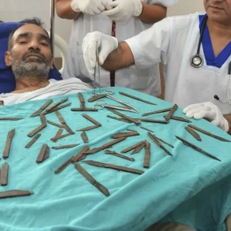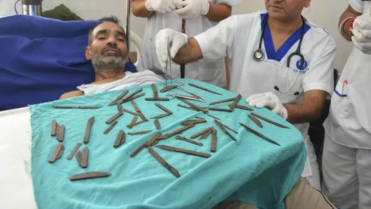 De 42-jarige Indiër Surjeet Singh klaagde al een tijdje over buikpijn. De chirurgen begrepen dat wel, want hij bleek veertig messen te hebben doorgeslikt. Artsen treffen wel vaker lichaamsvreemde objecten aan in magen.