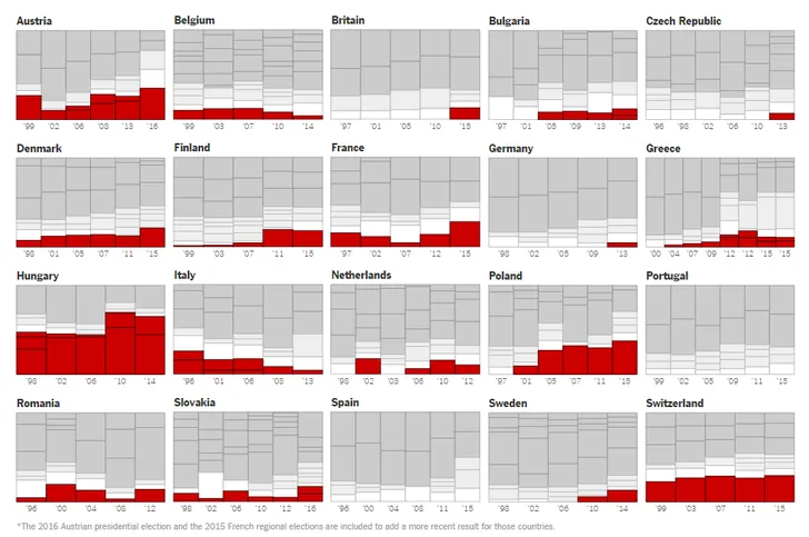 Het resultaat is een overzicht van de meeste Europese landen, naar meest recente verkiezingen. Op de website van The New York Times zijn de grafieken interactief. Hieronder toch een overzicht van de resultaten. De donkergrijze blokken zijn centrumlinkse en centrumrechtse partijen (in Nederland: VVD, CDA, D66 en PvdA). Rood zijn extreemrechtse partijen (in Nederland: PVV en LPF). Lichtgrijs en wit zijn andere partijen, waaronder (extreem-)links.