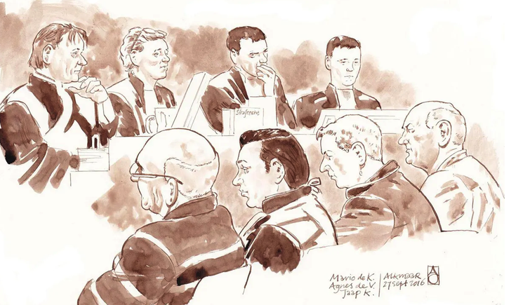 De derde verdachte was Mario de K. Hij was kaal als Jaap K. en had leukemie. In een e-mail aan mijn vader schreef ik: ‘Net als Jaap is hij een ex van Agnes en ook dit vriendelijk ogende heerschap is al behoorlijk op leeftijd. Nou ja, ik kan nog wel uren schrijven over de rechtszaak, het ene detail is nog bizarder dan het ander, een heel apart stel schurken. Ik zat naast Freddies familieleden op de tribune en die konden ook nauwelijks geloven wat ze hoorden. Maandag gaat het proces weer door en dan ben ik er weer. Heel merkwaardig, zo’n schaduwwereld en daarom zo fascinerend. Je zou zo’n verhaal nooit kunnen verzinnen. Groet.’