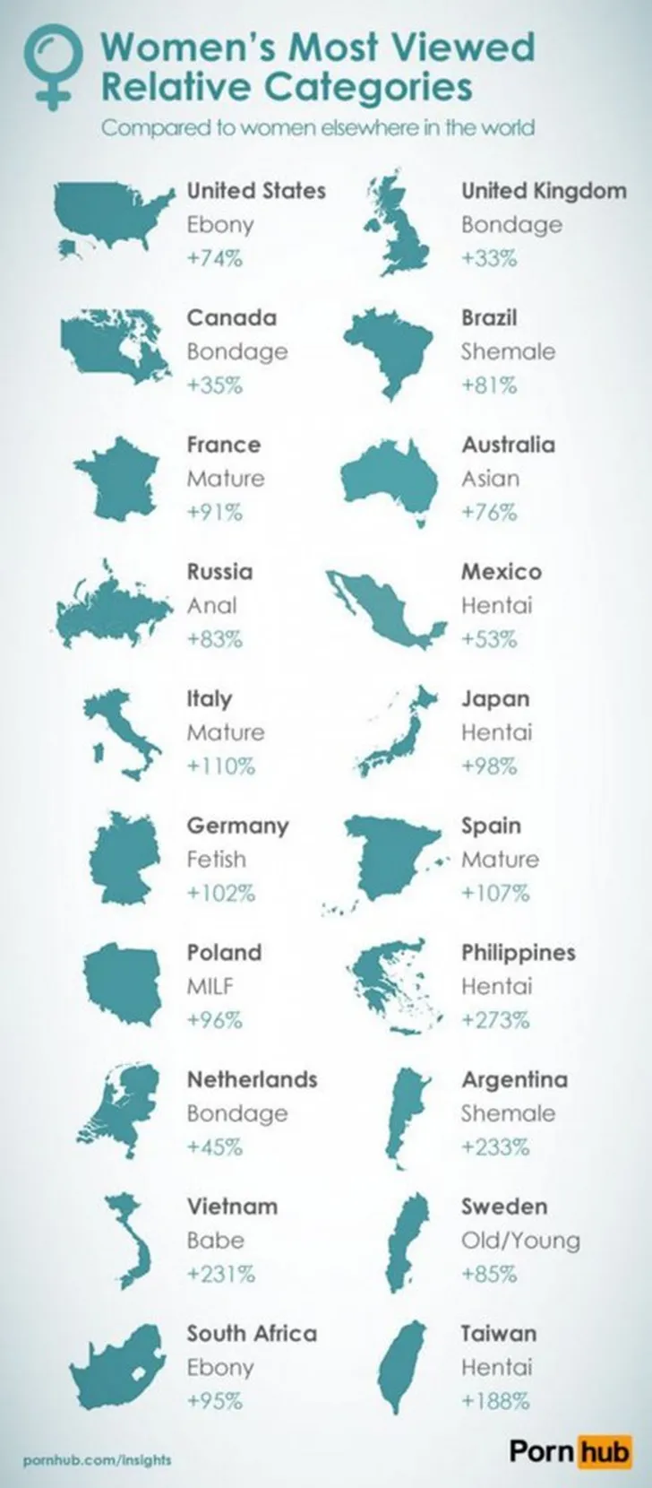 Dan de Nederlandse vrouw. Die houdt vergeleken met de rest van de wereld het meest van 'bondage'. Ook goed om te weten. Een ander opmerkelijk gegeven is dat Braziliaanse en Argentijnse vrouwen massaal zoeken op 'shemale'. Of shemales zijn meegenomen in het onderzoek, is niet helemaal duidelijk.