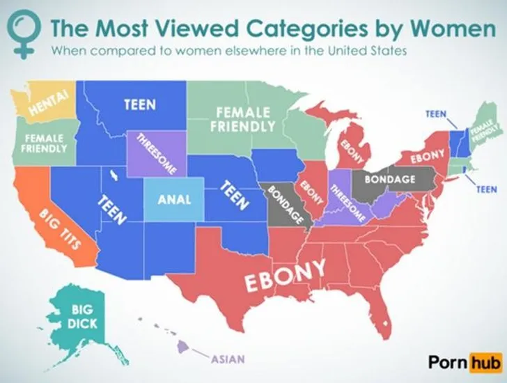 PornHub heeft ditmaal op basis van zoektermen uit de doeken gedaan waar vrouwen het wildst van worden. 'Lesbian' is verreweg het populairst onder dames, zo blijkt. Slechts in een paar delen van de wereld zoeken vrouwen meer op een andere term. Zo gaan vrouwen in Midden-Afrika, Kazachstan en China los op respectievelijk 'ebony' (donkere vrouwen), 'big dick' en 'hentai' (animatie-porno).