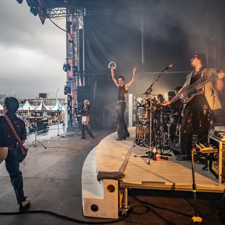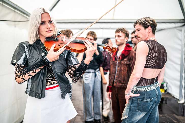 Akkermans speelt viool, tamboerijn en trompet, want Son Mieux bedient zich van een rijk instrumentarium. Op het podium staan nog allerlei percussie-instrumenten, tamboerijnen en een saxofoon naast de vertrouwde basis van drums, bas en gitaar klaar voor gebruik. ‘Wij staan vooral te schreeuwen met een drumcomputer. Son Mieux, dat zijn echt muzikanten, zij kunnen allemaal op zowat elk instrument spelen,’ zegt Milo Driessen, een van de drie zangers van Goldband, bewonderend als Son Mieux zich klaarmaakt om te spelen. ‘Ik vind ze echt heel goed, hun energie ook. Te gek.’ Driessen vergaarde bekendheid door Goldbands doorbreeksingle Witte was (met daarin de zinsnede ‘waarom is coke zo fucking duur’) in praktijk te brengen door een halfjaar geleden cocaïne te snuiven op het podium. Hij betuigde spijt en oogt vanavond broodnuchter. Maar backstage gaan onder andere muzikanten de cocktails en ijskoude biertjes al vroeg rond, en komt een aantal aan met een verwilderde of juist uiterst liefdevolle blik in de ogen. Camiel Meiresonne van Son Mieux snijdt in de witte kleedcontainer ondertussen met zorg een stronk gember in stukjes, stopt het in een Dopperfles met warm water en knijpt er vervolgens nog een halve fles honing in leeg. ‘Dit is mijn lifesaver. Perfect voor mijn stem, voor mijn energie.’ Klap op de schouder van de verslaggever. ‘Dit is heerlijk, man. Hier ga ik zo goed op. Moet ik voor jou ook iets maken?’