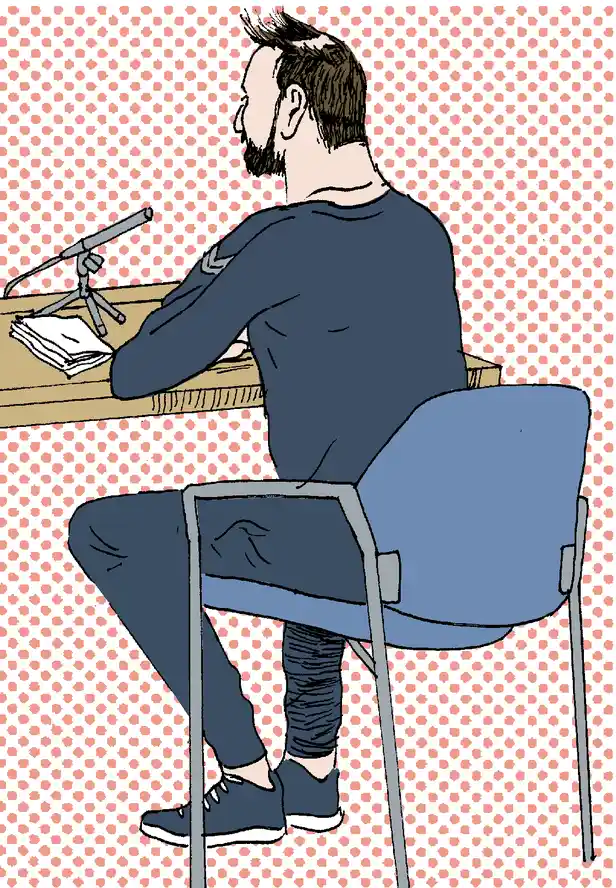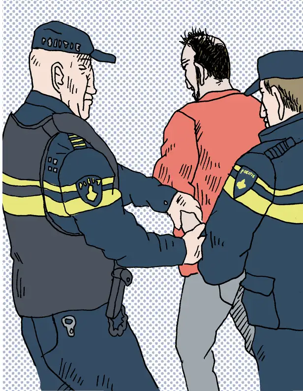 H. knikt en staat weer op. ‘Ik zie jou zo nog effe,’ fluistert hij naar zijn advocaat. Met een blanco gezichtsuitdrukking wordt hij weer meegenomen door de agenten.