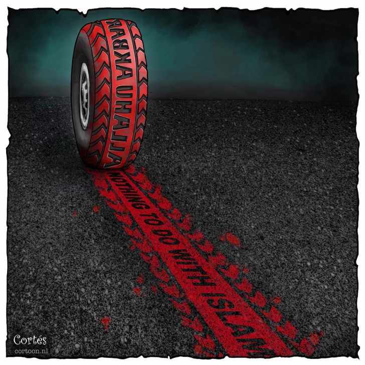 ‘In 2017 was er wat gedoe binnen de jury van de Inktspotprijs over een van mijn cartoons. Een bebloede autoband rolt over de weg. In het bandenprofiel zelf staat te lezen “Allahu Akbar”, maar op de afdruk op het asfalt staat “Nothing to do with islam”. Daarmee wilde ik de tegenstelling in beeld brengen tussen aanslagen die uit naam van de islam worden gepleegd en de mensen die daarna roepen dat dergelijke fanatici niks met de islam te maken hebben. De vakjury had de prent aanvankelijk afgekeurd. Misschien vanwege het bloed, misschien vanwege het woord islam, geen idee. Juryvoorzitter Claudia de Breij schreef in het juryrapport dat het haar niet lekker zat dat ze mijn cartoon hadden weggelegd, puur omdat die een werkelijkheid weergaf die ze liever niet zo zag. Omdat het haar tot denken aanzette, is de jury teruggekomen op zijn besluit en kreeg mijn cartoon een eervolle vermelding. Dat is dus precies wat je als cartoonist moet doen: zorgen voor discussie. Een groter compliment kun je niet krijgen.’