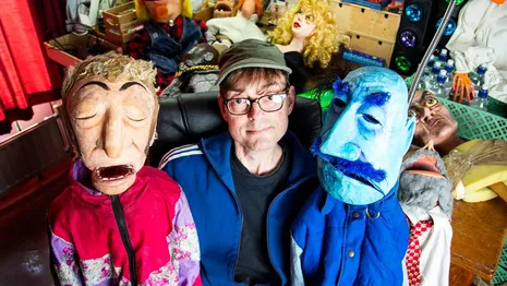 Na een beetje gestommel achter de voordeur verschijnt de 53-jarige Frans van der Meer in de deuropening. Frans is de geestelijk vader van poppen als Ferry van de Zaande, Fred van Boesschoten, Arend-Jan Stoetwegen en professor Hominilupus. Al jarenlang treedt hij op tijdens festivals, in theaters, op bruiloften en familiefeesten. Met de deurknop in de hand kijkt hij me heel eventjes onderzoekend aan, dan glimlacht hij. ‘Welkom in mijn nederige stulpje,’ mompelt hij traag.
