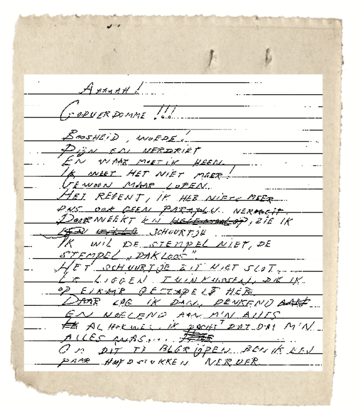Veertien dagen later spreek ik hem weer. Michel heeft in die tussentijd geen letter op papier gezet, maar als zijn boek ter sprake komt, gaat hij direct zijn schrijfblok halen in de kamer van zijn tijdelijke opvang in Haarlem. En na enige aandrang van mijn kant begint hij te pennen.