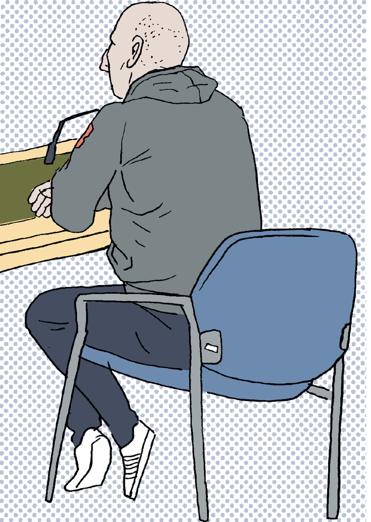Zo ook bij de 27-jarige meneer B. die met gekromde rug en armen een beetje wiebelig de zaal binnenstapt, gevolgd door zijn moeder, een oud, mager en gerimpeld dametje, met een constante blik in haar ogen die verraadt dat ze het eigenlijk ook allemaal niet meer weet. B. praat binnensmonds en dus vrij onverstaanbaar, als de eerste formaliteiten worden besproken.
