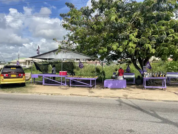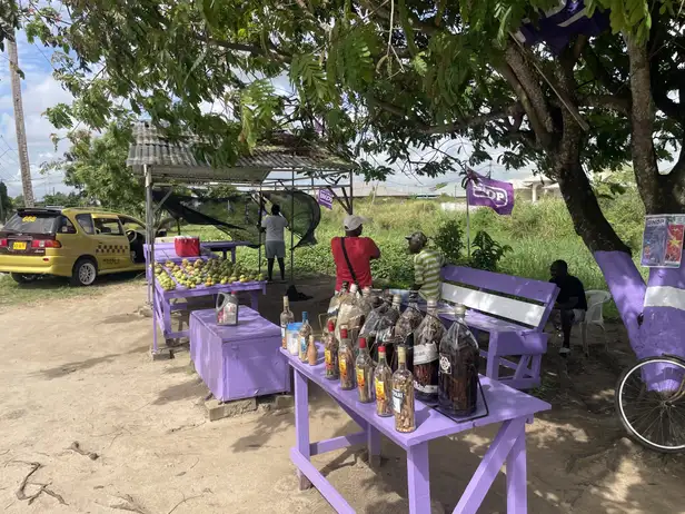 Gregory John (37) zit onderuitgezakt op een witte plastic stoel aan de Langatabikistraat in de volksbuurt Tammenga in Paramaribo. Zijn oom zit op een paarsgeverfd houten bankje tegenover hem. Zijn neef staat achter een mangokraam een paar meter verderop, ook paarsgeverfd. Voor John staat een kraampje met lege rumflessen Borgoe gevuld met houtsnippers uit het binnenland die goed zouden zijn voor de potentie van de man. De berm waarin zij zitten, is omgeven met paarse vlaggen met NDP erop, de Nationaal Democratische Partij, de politieke partij van Desi Bouterse.