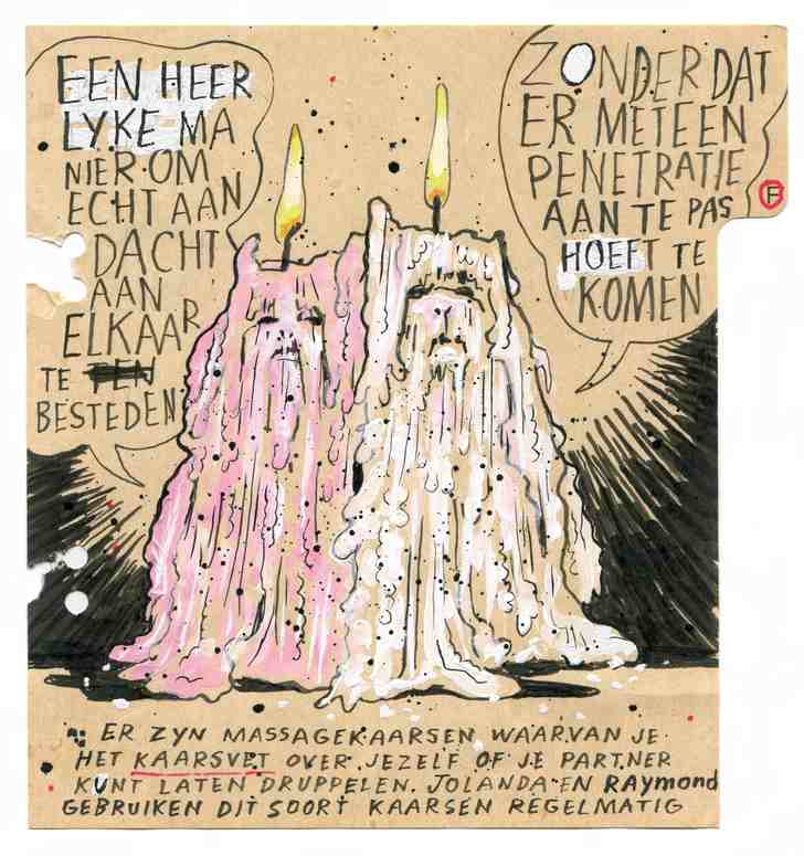 Jolanda (48) en Raymond (50) zijn al ruim twintig jaar bij elkaar en gebruiken dit soort kaarsen heel regelmatig. Ze doen er vooral body-to-bodymassages mee, dat vinden zij een heerlijke manier om te ontspannen en echt aandacht aan elkaar te besteden zonder dat er meteen penetratie van moet komen. Al loopt het daar heel regelmatig alsnog op uit. ‘Soms spreken we af om geen seks te hebben, maar elkaar alleen lekker te masseren,’ zegt Jolanda daarover. ‘Maar als we dan zo lang aan elkaars lijf gezeten hebben, krijgen we heel vaak toch zin. Het blijft eigenlijk maar zelden echt alleen bij een massage.’
