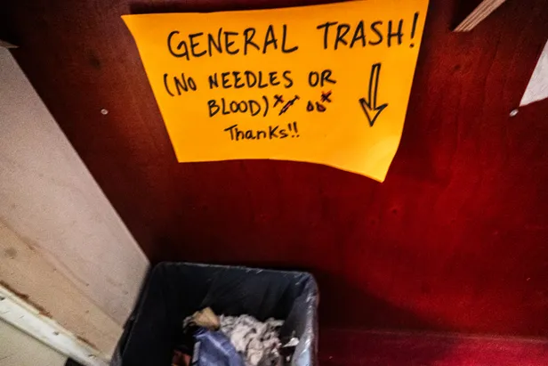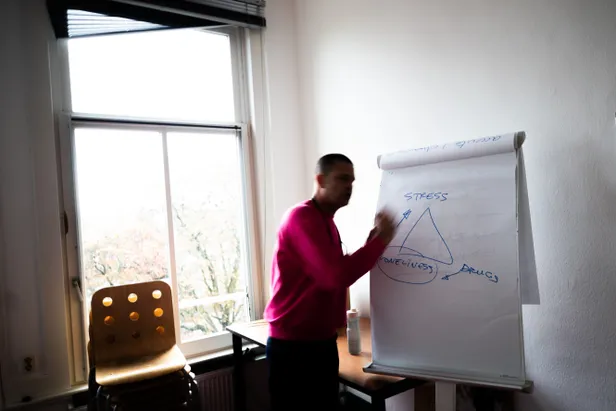 We lopen tien minuten door de miezerregen richting de Stadhouderskade en kloppen daar aan bij stichting De Regenboog Groep. Achter de smalle deur beland je in een chaotische wirwar van vrijwilligers, daklozen, drugsverslaafden en een scala aan kleurrijke figuren. Op de tweede verdieping overziet ‘harm reduction specialist’ Cedric Charvet de gebruikersruimte: een kamer van 30 vierkante meter met grote ramen, vier ronde tafels en een tiental houten stoeltjes.