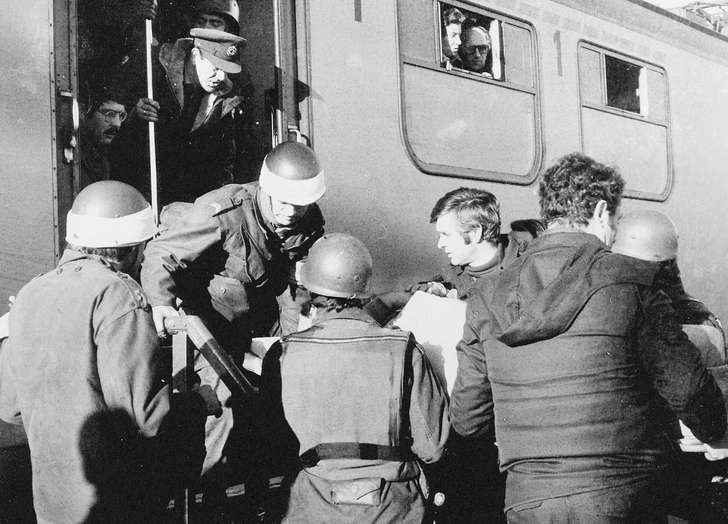 De kapers laten hem nog even naar het toilet gaan. Daarna leiden ze hem in stilte naar het balkon. Het is 12.45 uur. Op honderden meters afstand richt één persfotograaf, de enige die door de politie over het hoofd is gezien, zijn telelens op de trein. Hij legt vast hoe een man, handen vastgebonden en de rug gebogen, in de deuropening knielt. Eén schot. Hij valt op de rails. Een van de kapers klimt naar buiten en snijdt de touwen los. Een dag later, het is dan Sinterklaas, staan de foto’s in de krant.