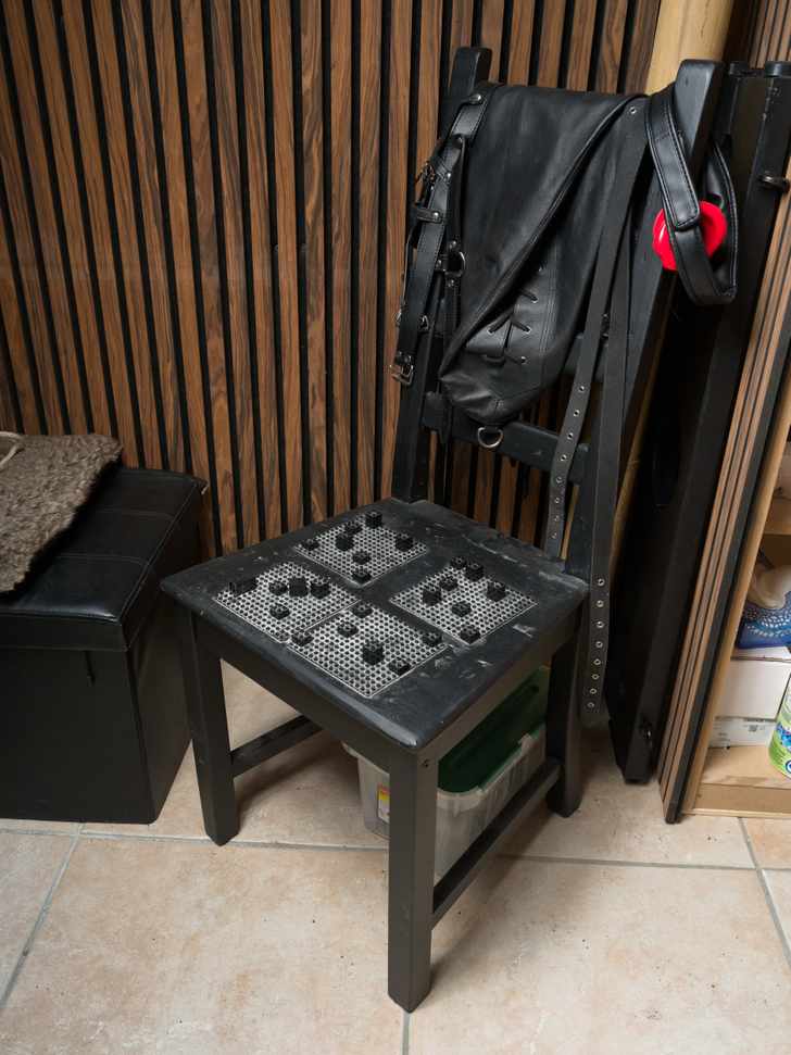 Wie voor het eerst in zijn leven binnenstapt in een bdsm-speelkamer, kan niet anders dan onder de indruk zijn. Ik zie een massagetafel (waar vermoedelijk weinig tot geen massages plaatsvinden), een redelijk eng schandblok (waar ik tot mijn grote blijdschap niet mijn eigen hoofd hoef in te steken), touwen en zweepjes in alle soorten en maten en een tafel vol apparaten en objecten die Fifty Shades of Grey devalueren tot een Disney-familiefilm.
