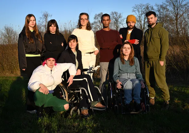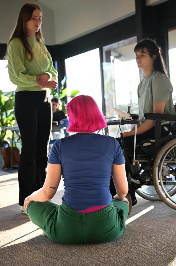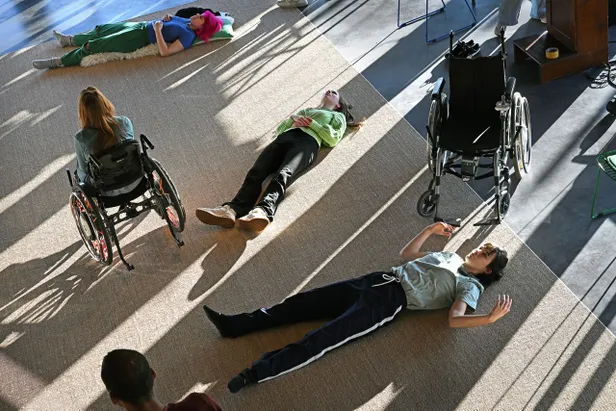 De acteerles begint met een warming-up. ‘Kom op twee voeten staan, als je dat kan,’ roept Hidde. Er vormt zich een kring. Twee mensen zitten in een rolstoel, iemand blijft op de grond zitten, de rest staat. Ook de gebarentolk van een van de acteurs doet mee. Op Hiddes aanwijzingen draaien ze hun hoofden, zwaaien met hun armen en bewegen hun heupen. Tenminste, voor wie dat mogelijk is. Iedereen doet de oefeningen op zijn eigen manier. Dat is precies de bedoeling.