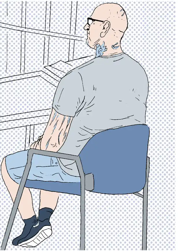 In de publieksbanken, achterin de zaal, zit het slachtoffer, met om hem heen een paar toeziende agenten. Het slachtoffer, de man met de meervoudige kaakbreuk, schedelbreuk en zenuwschade, oogt vermoeid. Angstig haast. Alsof hij vanochtend al zijn moed bijeen geschraapt heeft om naar de rechtbank te komen, om meneer S. onder ogen te komen. De advocaat deelt wat foto’s uit van een schuurtje aan een zwembad, waar het noodlottige voorval zich afgespeeld zou hebben. Hij laat zien dat het schuurtje een beetje gammel was, en impliceert dat het allemaal erg slecht geïsoleerd is.